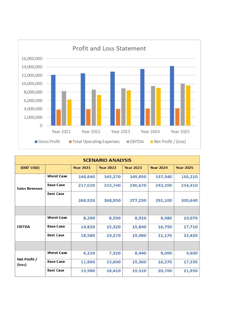 A comprehensive business plan was developed to outline expected financials and operations over the next five years. Three scenarios (Base Case, Worst Case, and Best Case) were created, illustrating sales volumes based on ship traffic, the percentage of visiting ships ordering fuel, and the average refueling volume per ship.